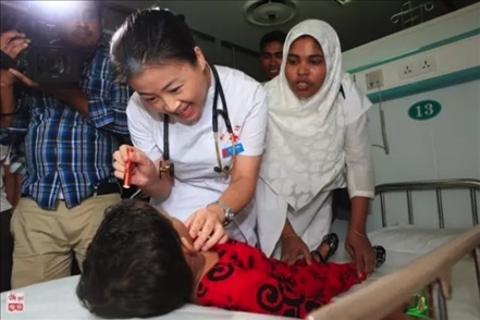 2013年,“和平方舟”號醫(yī)院船再次來到孟加拉國。上萬民眾自發(fā)涌向中國醫(yī)院船,最高單日門診1700余人次。3歲的阿里法·沁健康么?中國軍醫(yī)牽掛著她。她家住在偏僻農村,中國軍醫(yī)設法找到了她,邀請她登上“和平方舟”號醫(yī)院船體檢。