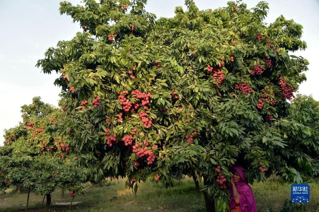 6月4日,農(nóng)民在孟加拉國(guó)迪納杰布爾的果園里采摘荔枝。新華社發(fā)