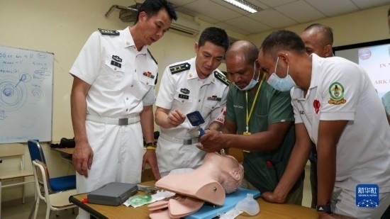 中國海軍“和平方舟”號醫(yī)院船派出醫(yī)療專家分隊赴東帝汶國立醫(yī)院進(jìn)行ACLS培訓(xùn),醫(yī)院船醫(yī)療專家為當(dāng)?shù)蒯t(yī)護(hù)人員進(jìn)行實(shí)操講解(9月5日攝)。新華社記者 黎云 攝