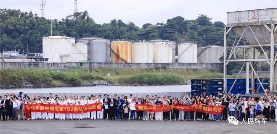 當(dāng)日上午9時(shí),懸掛著中加兩國(guó)國(guó)旗的編隊(duì)艦艇緩緩靠泊奧文多港碼頭,中國(guó)駐加蓬大使李津津及使館工作人員、當(dāng)?shù)刂匈Y機(jī)構(gòu)人員、華人華僑代表,加蓬國(guó)防部秘書(shū)長(zhǎng)彭吉中將及官兵代表等300余人位碼頭迎接。