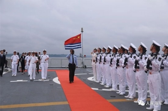 隨后,李津津大使及彭吉中將等一行人登上南寧艦進(jìn)行參觀,彭吉中將在南寧艦艦長(zhǎng)和政委的陪同下,檢閱了南寧艦儀仗隊(duì)。