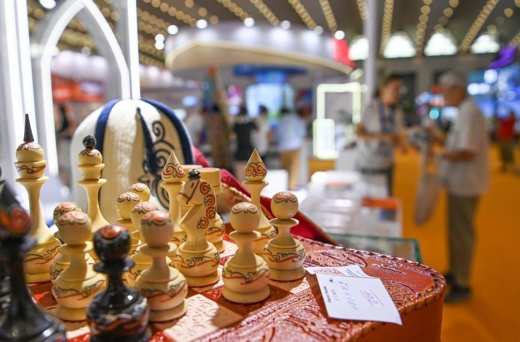 8月19日,參觀者在交流合作館吉爾吉斯斯坦展區(qū)了解特色商品。新華社記者 鄒競(jìng)一 攝