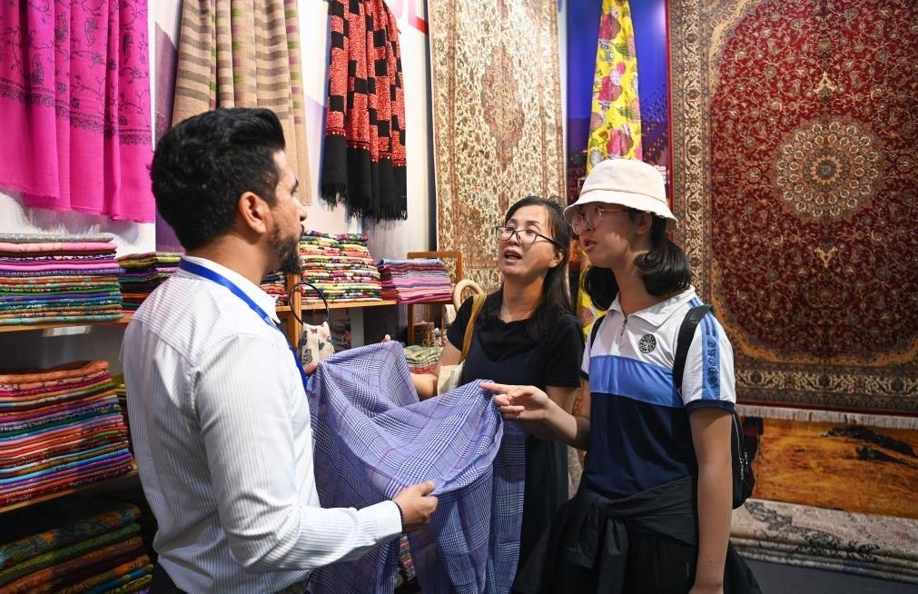 8月17日,參觀者在交流合作館尼泊爾展區(qū)了解特色商品。新華社記者 鄒競(jìng)一 攝