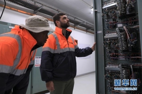 8月10日,在南非北開(kāi)普省德阿鎮(zhèn),當(dāng)?shù)鼐用?、變電站工作人員達(dá)斯溫·巴松(左)與變電站副主管雷加特·范滕德在龍?jiān)茨戏枪镜掳L(fēng)電項(xiàng)目變電站工作。新華社記者 董江輝 攝