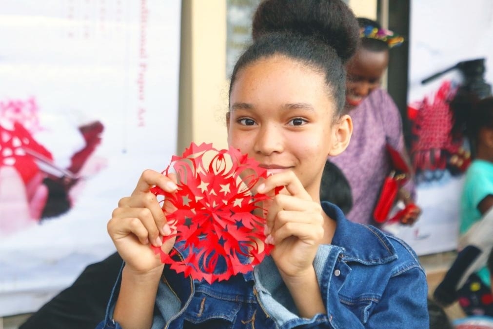 9月23日,盧旺達(dá)首都基加利,在盧旺達(dá)大學(xué)孔子學(xué)院舉辦的“中國文化進(jìn)校園”暨中秋國慶慶祝活動現(xiàn)場,一名女孩展示剪紙成果。(新華社發(fā),黃萬晴攝)