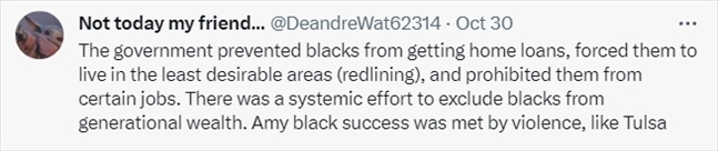 還有網(wǎng)友表示,美國政府在加劇美國財富不平等方面“功不可沒”。在美國政策高壓之下,非裔甚至不配擁有住房。
