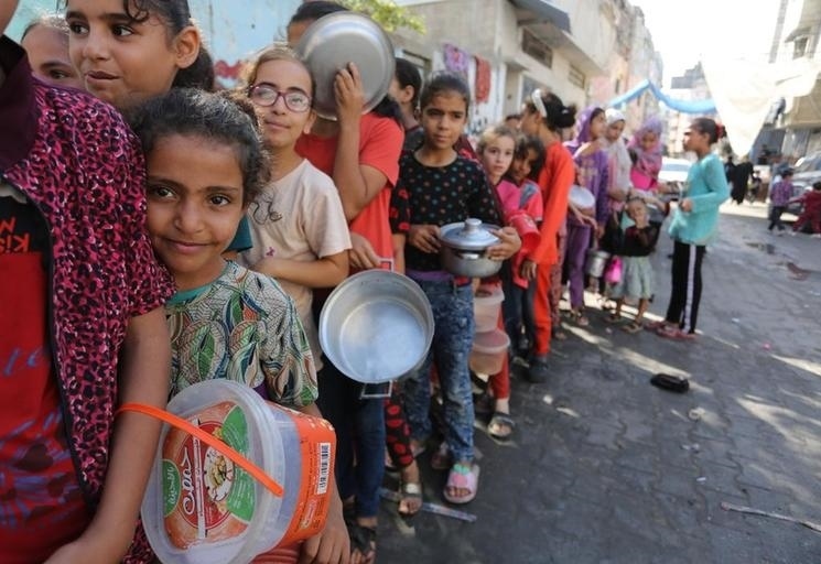 11月9日,在加沙地帶南部城市拉法,人們在一個臨時分發(fā)點(diǎn)排隊(duì)領(lǐng)取食物。新華社發(fā)(哈立德·奧馬爾攝)