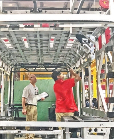 在位于美國加州蘭卡斯特市的比亞迪大巴工廠里,工作人員正在檢查設備。郜夢日攝