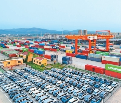 11月28日,在位于江西省贛州市南康區(qū)的贛州國(guó)際陸港,比亞迪新能源汽車將通過鐵路運(yùn)送至深圳鹽田港出口國(guó)外。
