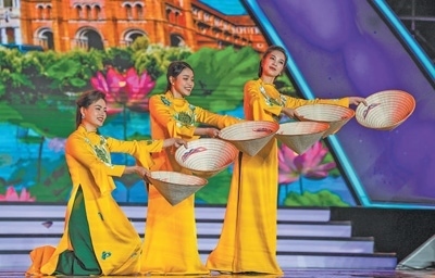 11月30日,2023年瀾滄江·湄公河流域國(guó)家文化藝術(shù)節(jié)開(kāi)幕式暨文藝晚會(huì)在云南景洪市舉行。圖為來(lái)自越南的藝術(shù)工作者在表演舞蹈《斗笠舞》。新華社記者 胡 超攝