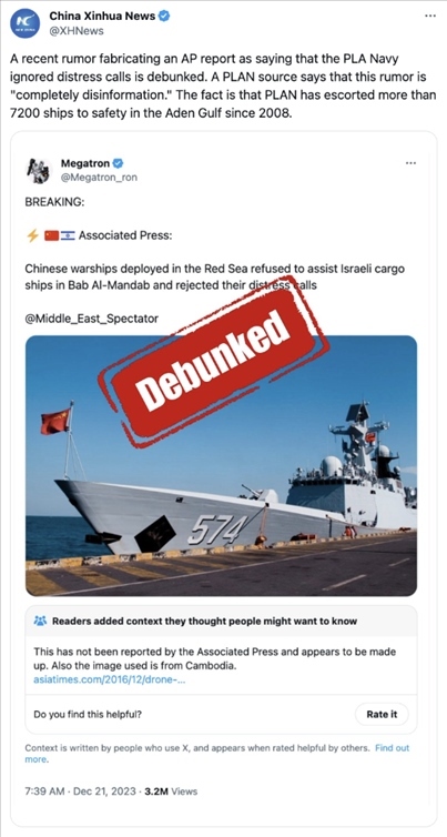 一個(gè)有十多萬(wàn)“粉絲”的社交賬號(hào)日前以美聯(lián)社為“信源”發(fā)帖稱,中國(guó)軍艦在紅海拒絕救援外國(guó)船只,攻擊抹黑中國(guó)軍方,挑動(dòng)相關(guān)國(guó)家與中國(guó)對(duì)立,但這一謠言隨即被多個(gè)權(quán)威信源辟謠。事實(shí)上,美聯(lián)社根本沒有這則報(bào)道。