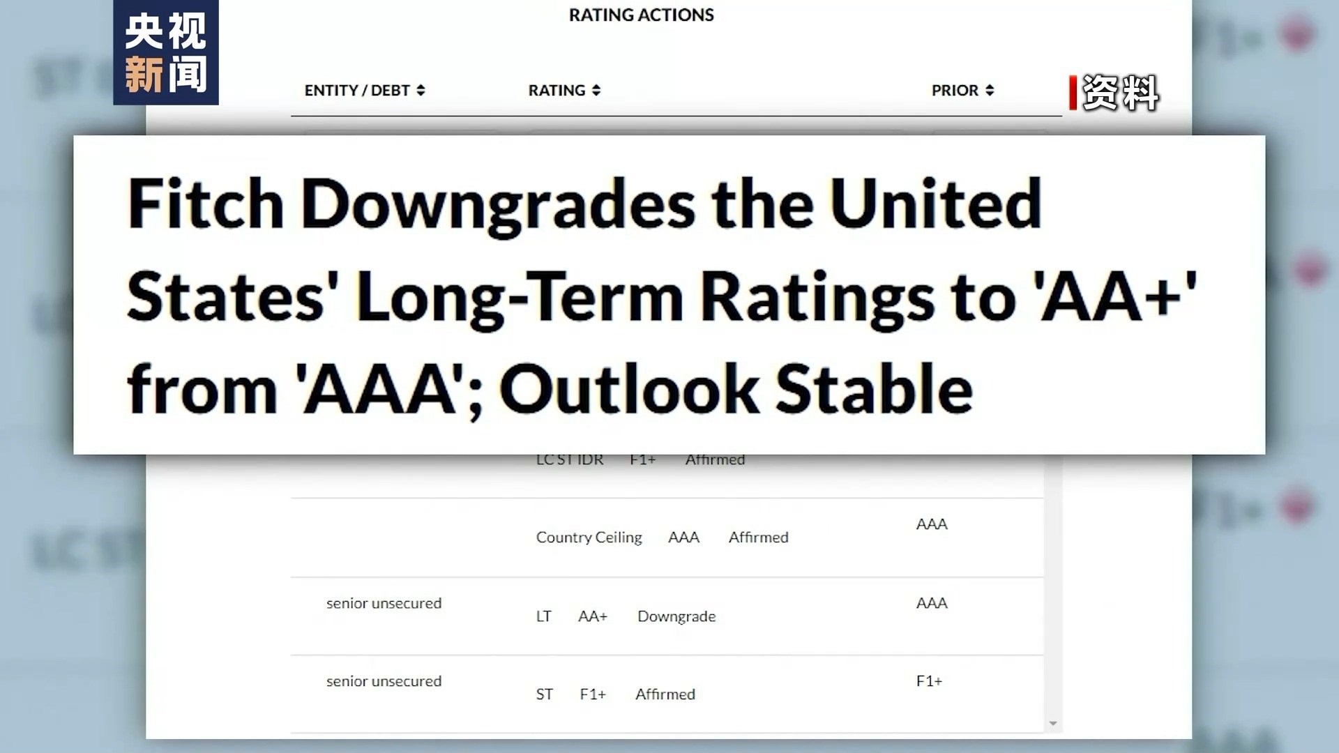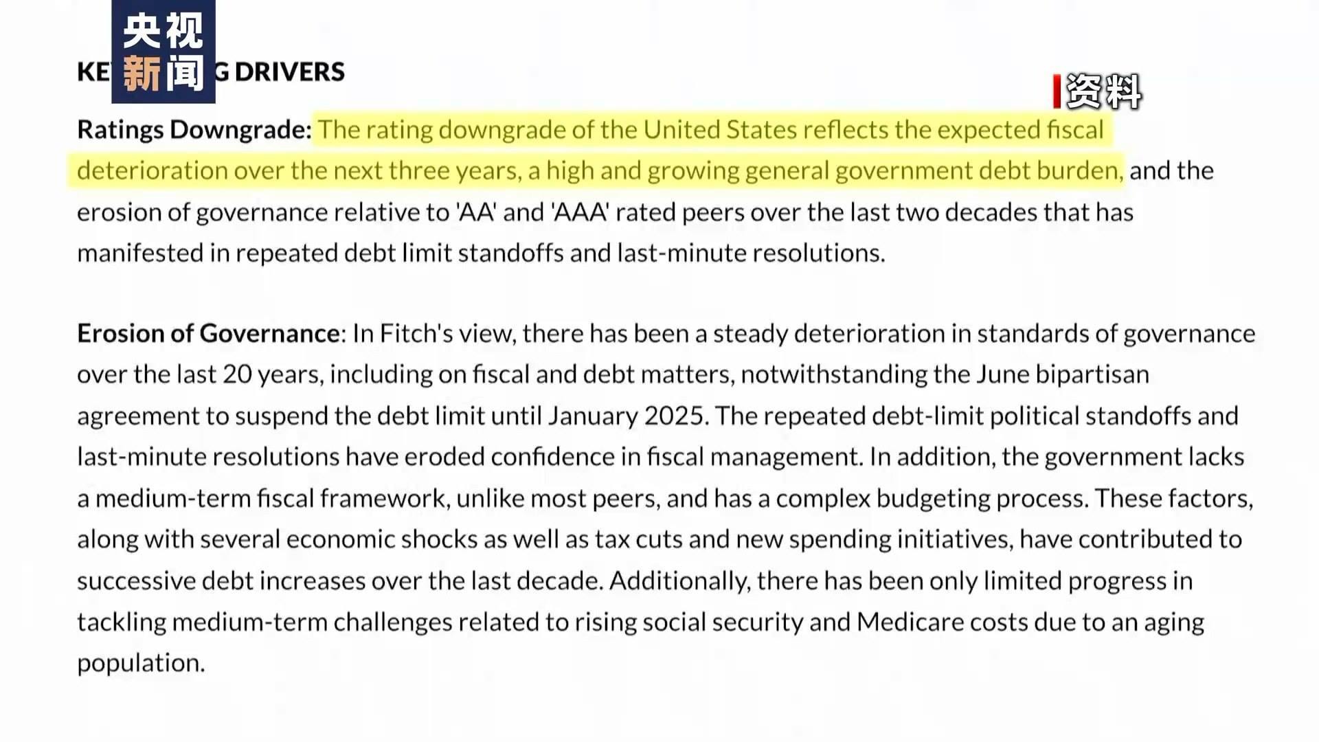 到了2023年8月1日,國際評級機構惠譽將美國長期外幣發(fā)行人違約評級從AAA下調至AA+?;葑u當天發(fā)表聲明說,下調美國信用評級主要由于美國政府債務負擔居高不下且不斷加重,未來3年財政狀況預計將持續(xù)惡化。