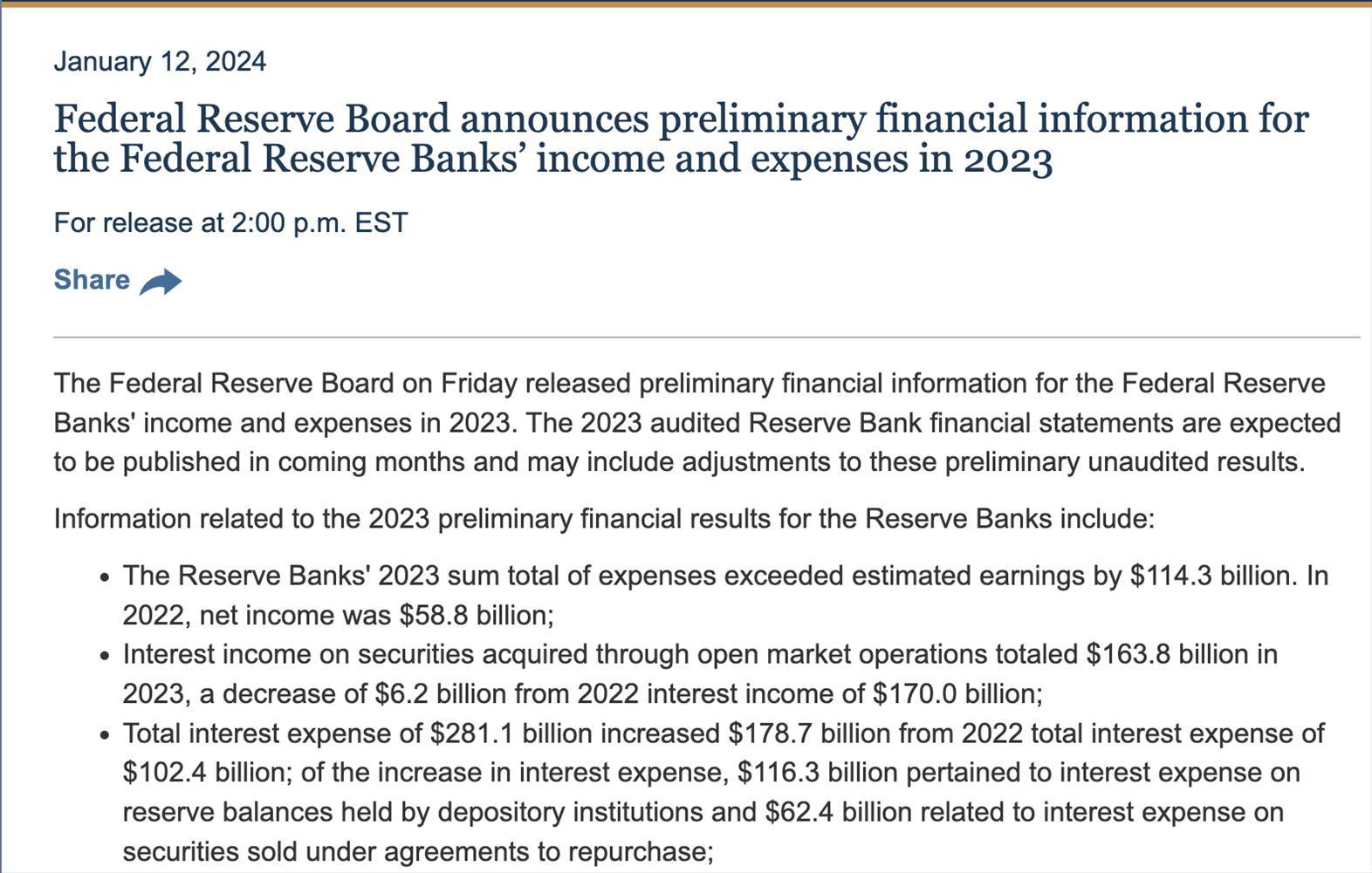 當(dāng)?shù)貢r(shí)間1月12日,美國聯(lián)邦儲(chǔ)備委員會(huì)(下稱“美聯(lián)儲(chǔ)”)在官網(wǎng)發(fā)文公布了美國聯(lián)邦儲(chǔ)備銀行2023年收入和支出的初步財(cái)務(wù)信息。