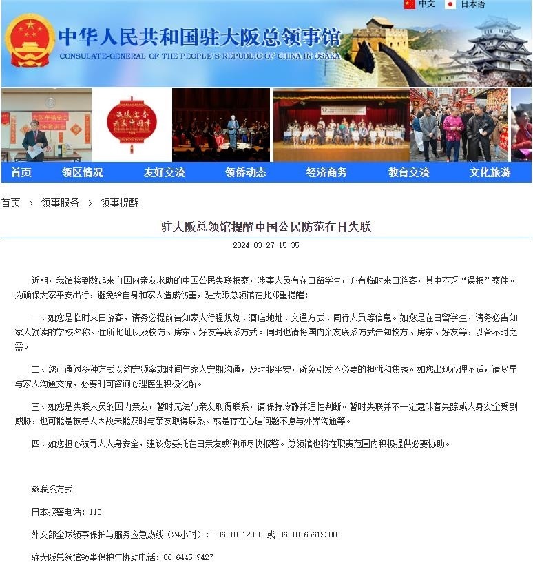 央視網(wǎng)消息:據(jù)中國駐大阪總領(lǐng)事館,近期,我館接到數(shù)起來自國內(nèi)親友求助的中國公民失聯(lián)報案,涉事人員有在日留學(xué)生,亦有臨時來日游客,其中不乏“誤報”案件。為確保大家平安出行,避免給自身和家人造成傷害,駐大阪總領(lǐng)館在此鄭重提醒:??