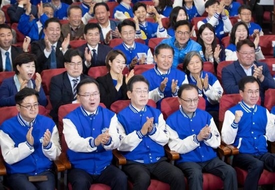 4月10日,在韓國首爾,韓國最大在野黨共同民主黨黨首李在明(前排中)與共同民主黨領(lǐng)導層共同慶祝出口民調(diào)結(jié)果大幅領(lǐng)先。新華社記者姚琪琳攝