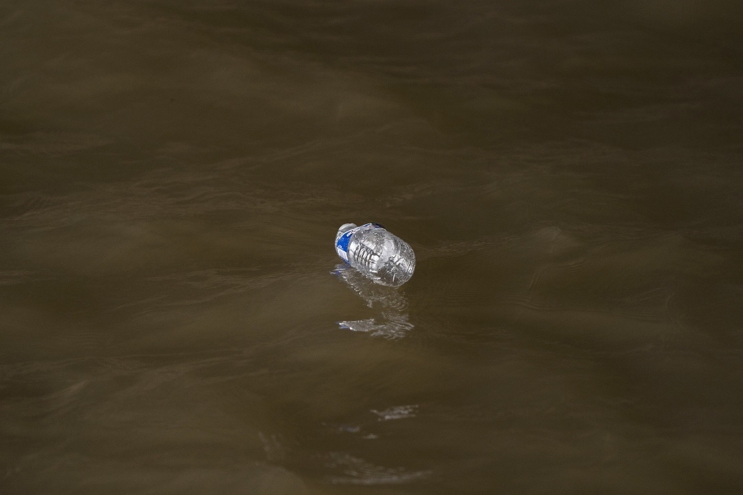 當(dāng)?shù)貢r(shí)間2024年2月14日,法國(guó)巴黎,一個(gè)塑料水瓶漂浮在塞納河的水面上。