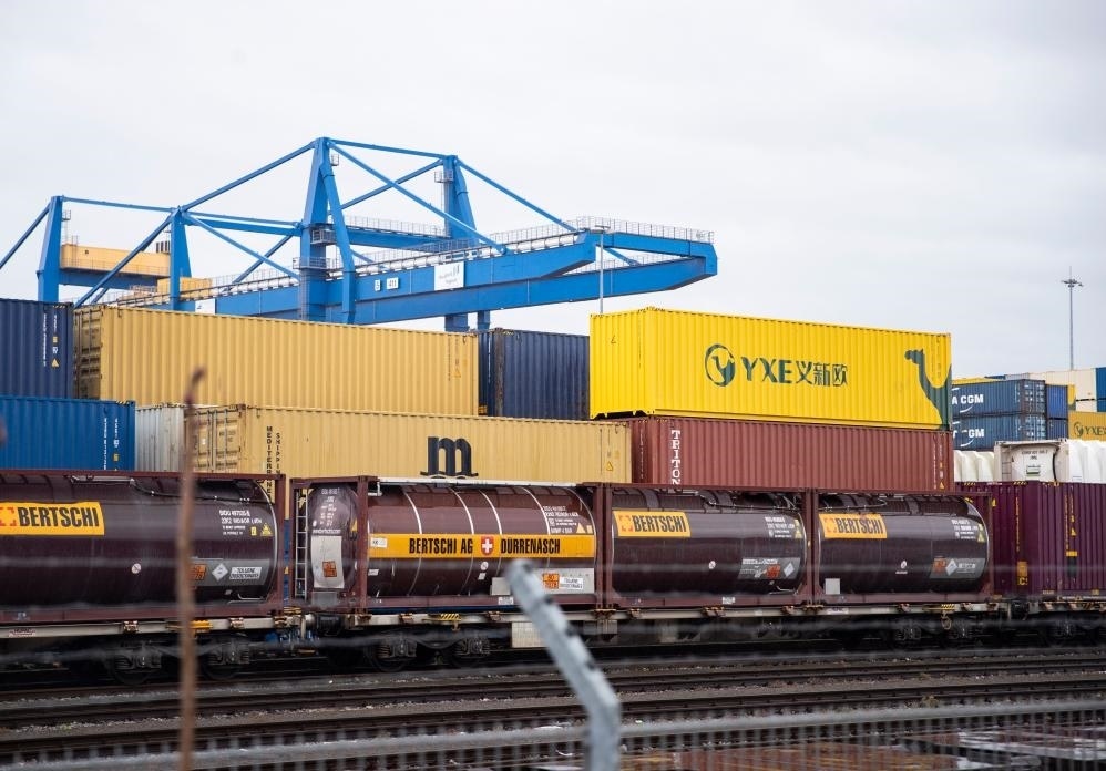 貨輪排隊???,火車鳴笛駛?cè)胴涍\場站,卡車搭載著印有“渝新歐”“義新歐”“西安港”等字樣的集裝箱往來奔馳……這座萊茵河畔的港口,一派繁忙景象。