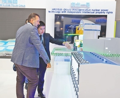 2023年11月,在法國(guó)巴黎舉行的第五屆世界核能工業(yè)博覽會(huì)上,參觀者在中國(guó)廣核集團(tuán)有限公司展臺(tái)前了解“華龍一號(hào)”核電機(jī)組模型。本報(bào)記者 尚凱元攝