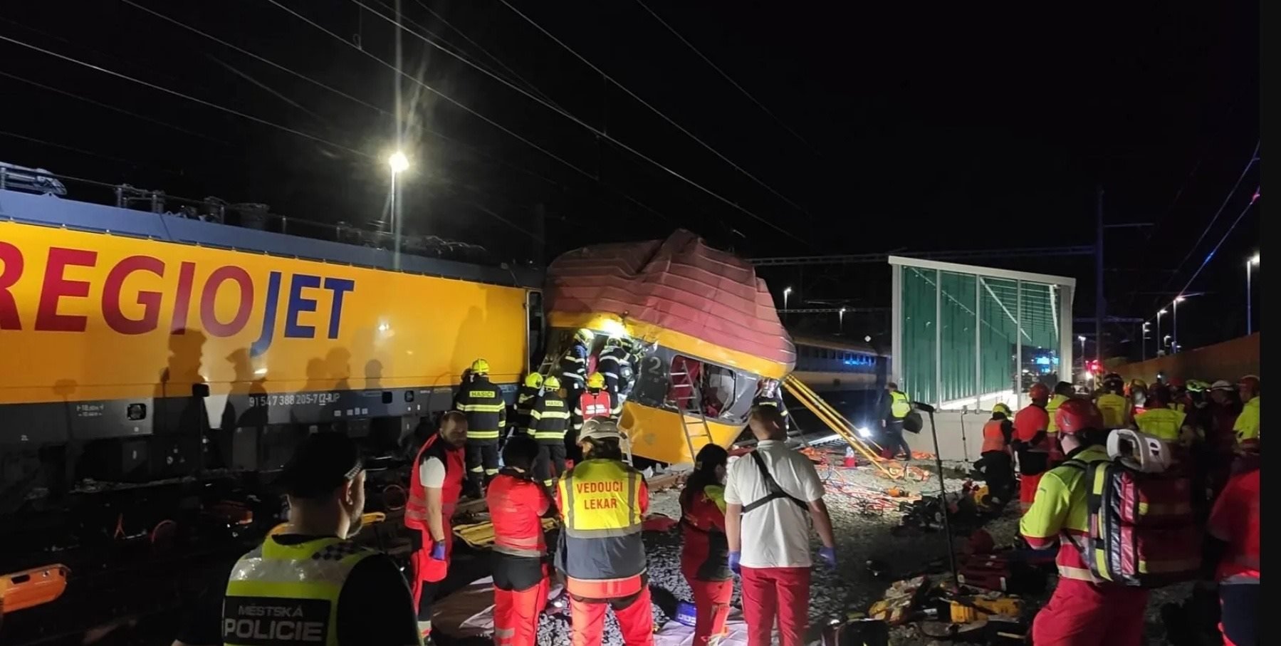 事發(fā)后,數十名警察、消防和救援人員趕赴現(xiàn)場。捷克“今日”新聞網站發(fā)布的現(xiàn)場視頻顯示,客運列車至少一節(jié)車廂脫軌側翻;警方通過社交媒體發(fā)布的圖片顯示,數輛應急服務車和一架直升機參與救援。