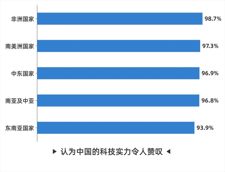 在科技表現(xiàn)方面,中國的科技實(shí)力同樣受到全球受訪者認(rèn)可。其中,92.3%的受訪者認(rèn)為中國的科技實(shí)力令人贊嘆,排名前五位的分別是非洲國家受訪者(98.7%)、南美洲國家受訪者(97.3%)、中東國家受訪者(96.9%)、南亞及中亞國家受訪者(96.8%)以及東南亞國家受訪者(93.9%)。