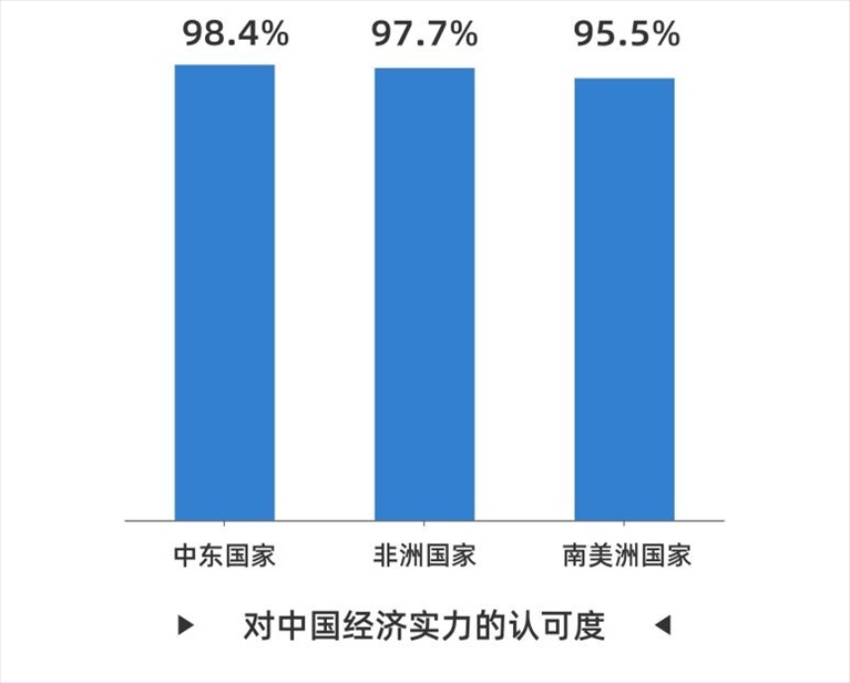 在經(jīng)濟(jì)表現(xiàn)方面,92.3%的受訪者稱贊中國經(jīng)濟(jì)實(shí)力強(qiáng)勁,這一調(diào)查結(jié)果與去年基本持平。其中,中東國家受訪者的認(rèn)可度達(dá)到98.4%,非洲國家和南美洲國家受訪者的認(rèn)同度分別為97.7%和95.5%。