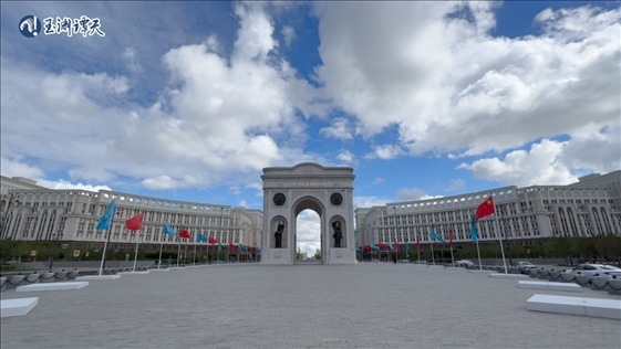 ||譚主抵達(dá)阿斯塔納,象征著哈薩克斯坦歷史的“凱旋門”周圍飄揚著歡迎旗幟