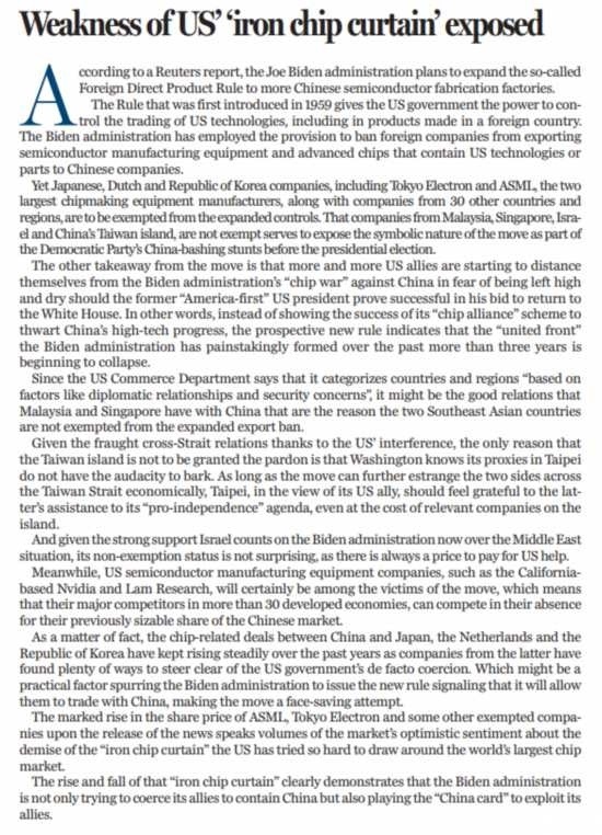 包括東京電子和阿斯麥兩大芯片設備制造商在內,來自日本、德國、韓國及其他30個國家和地區(qū)的相關企業(yè)將不會受到規(guī)則擴大的影響,但馬來西亞、新加坡、以色列和中國臺灣的相關企業(yè)卻未被豁免。這表明擴大規(guī)則范圍的象征意義遠大于實際意義,實則是民主黨在美國總統(tǒng)大選到來之前抨擊中國的戲碼。