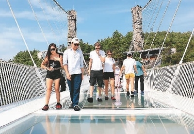 外國(guó)游客在湖南張家界大峽谷景區(qū)玻璃橋上參觀游覽。吳勇兵攝(人民圖片)