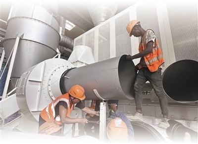 在科特迪瓦阿比讓可可加工廠內(nèi),中科工作人員正在安裝調(diào)試設(shè)備??铺氐贤甙⒈茸尵W(wǎng)記者 希普林·夸西攝