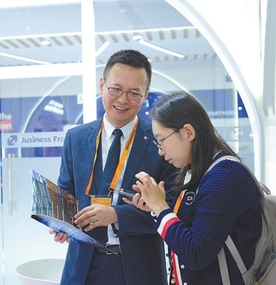 服貿(mào)會期間,法國智奧會展集團(tuán)工作人員與參展觀眾洽談業(yè)務(wù)。歐陽功成攝