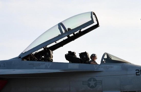 2017年7月22日,在美國弗吉尼亞州諾??撕\娀?,飛行員坐在“福特”號(hào)航母上的F/A-18戰(zhàn)斗機(jī)中。新華社記者殷博古攝