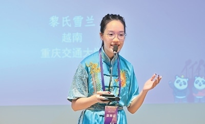 來(lái)自越南的黎氏雪蘭來(lái)到中國(guó)之后,對(duì)武術(shù)產(chǎn)生了濃厚興趣。圖為她在比賽現(xiàn)場(chǎng)和大家分享自己學(xué)習(xí)武術(shù)的經(jīng)歷。