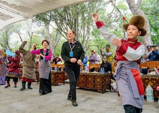 2023年5月,柯馬凱參觀林芝市第二小學(xué)。圖為柯馬凱(前排右二)和藏族民眾一同跳舞。