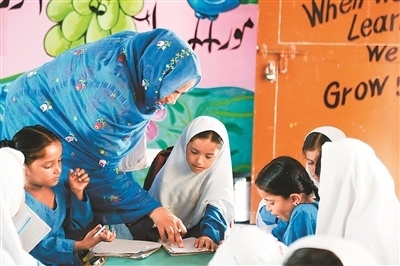走進(jìn)干凈整潔的校園,讀書聲、嬉戲聲聲聲入耳,孩童的活力、青春氣息撲面而來。在八年級的課室里,戴著一條寫有“文學(xué)比賽冠軍”紅綬帶的女學(xué)生薩伊巴·阿斯加爾·阿里成功搶到了回答問題的機會,正在大聲地在全班面前朗誦英語課文。薩伊巴告訴記者,她有7個姐妹,如果沒有這所學(xué)校,她可能就沒學(xué)上了。