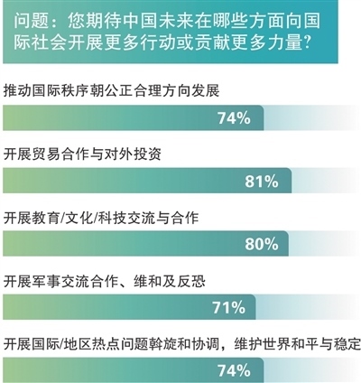 近七成國(guó)外受訪民眾期待中國(guó)未來(lái)更多參與國(guó)際事務(wù)或發(fā)揮更大作用。近九成支持中國(guó)在有關(guān)國(guó)際機(jī)構(gòu)、機(jī)制或平臺(tái)中發(fā)揮更大作用。八成多期待中國(guó)在經(jīng)貿(mào)合作與教科文兩個(gè)領(lǐng)域作出更多國(guó)際貢獻(xiàn);七成多期待中國(guó)在國(guó)際秩序建設(shè)、維護(hù)和平穩(wěn)定方面發(fā)揮更大作用。國(guó)外受訪民眾對(duì)“構(gòu)建人類命運(yùn)共同體”的認(rèn)知率達(dá)66%,對(duì)三大全球倡議和共建“一帶一路”倡議的認(rèn)知率為七成左右。對(duì)“平等有序的世界多極化”和“普惠包容的經(jīng)濟(jì)全球化”兩項(xiàng)主張,國(guó)外受訪民眾有超過(guò)半數(shù)認(rèn)同。