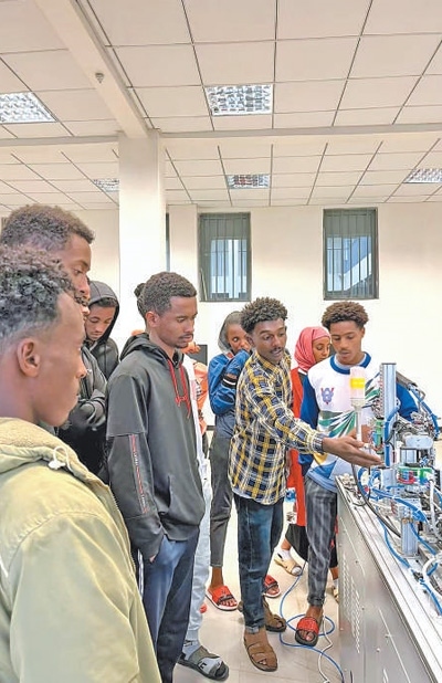 埃塞俄比亞魯班工坊當?shù)亟處煘閷W生們講解機電一體化設備的操作方法。