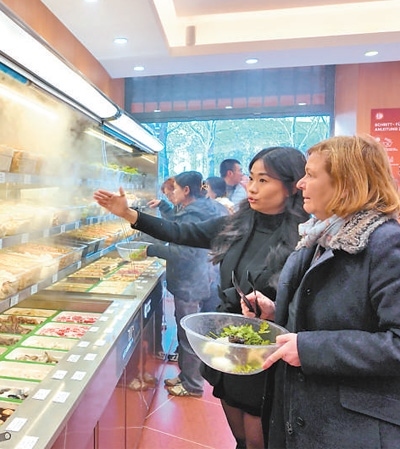 在柏林市中心,一家新開不久的“楊國福麻辣燙”店門口,當(dāng)?shù)厝思{爾夫和幾個(gè)好友推門而入。店內(nèi)熱氣騰騰,空氣中彌漫著濃郁的骨湯香氣。在排隊(duì)取餐的人群中,不乏像納爾夫這樣的外國朋友。他們拿起夾子和菜盆,熟練地自選食材(見圖②,本報(bào)記者劉赫攝):藕片、菠菜、凍豆腐、寬粉、蝦和牛肉卷……幾分鐘后,一碗香氣四溢的麻辣燙被端上餐桌。