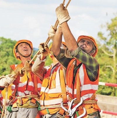 中外工人在東海岸鐵路項目上合作施工。