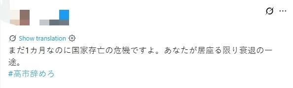 還有網(wǎng)友批評稱,高市上臺僅僅一個(gè)月,日本就面臨國家生存危機(jī),如果高市繼續(xù)當(dāng)首相,國家會走向衰落。