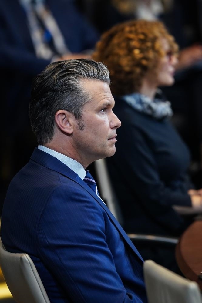 10月15日,美國國防部長赫格塞思在比利時布魯塞爾出席北約防長會議。新華社記者彭子洋攝
