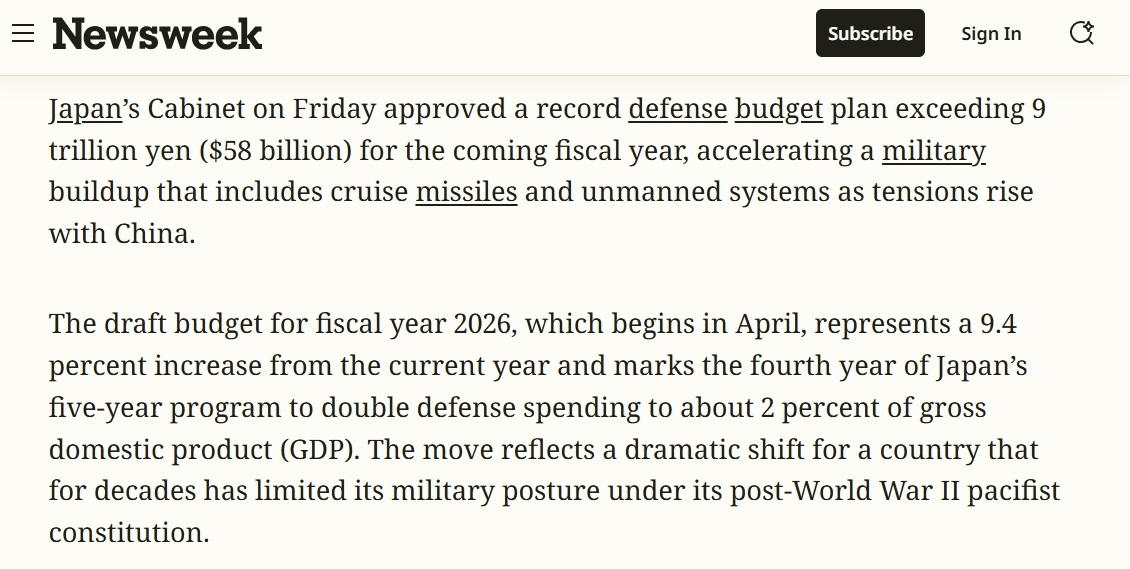 美國《新聞周刊》的報道稱,日本2026財年防衛(wèi)預(yù)算比今年增加了9.4%。新預(yù)算的一個重點是加強日本“遠距離打擊敵方目標(biāo)的能力”,這大大偏離了日本長期以來嚴格限制使用武力用于自衛(wèi)的原則。