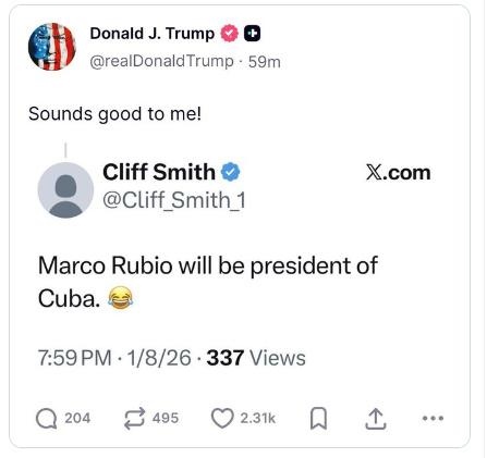 據(jù)報道,特朗普在其社交平臺“真實社交”(Truth Social)上回應(yīng)了一名用戶早些時候發(fā)布的一則帖文,內(nèi)容寫道“魯比奧將成為古巴總統(tǒng)”。特朗普轉(zhuǎn)發(fā)時附上評論:“我覺得不錯!”
