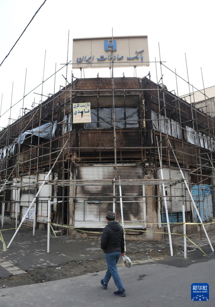 1月21日,在伊朗首都德黑蘭,一名男子走過在近期騷亂事件中受損的銀行。新華社記者 沙達(dá)提 攝