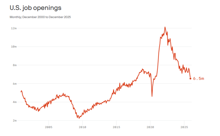 美國(guó)勞工統(tǒng)計(jì)局當(dāng)?shù)貢r(shí)間5日公布的數(shù)據(jù)顯示,美國(guó)當(dāng)前市場(chǎng)上的職位空缺數(shù)量降至2020年以來的最低水平。同時(shí)有報(bào)告顯示,美國(guó)企業(yè)1月裁員數(shù)量創(chuàng)下2009年以來的最高紀(jì)錄,引發(fā)多家媒體熱議。