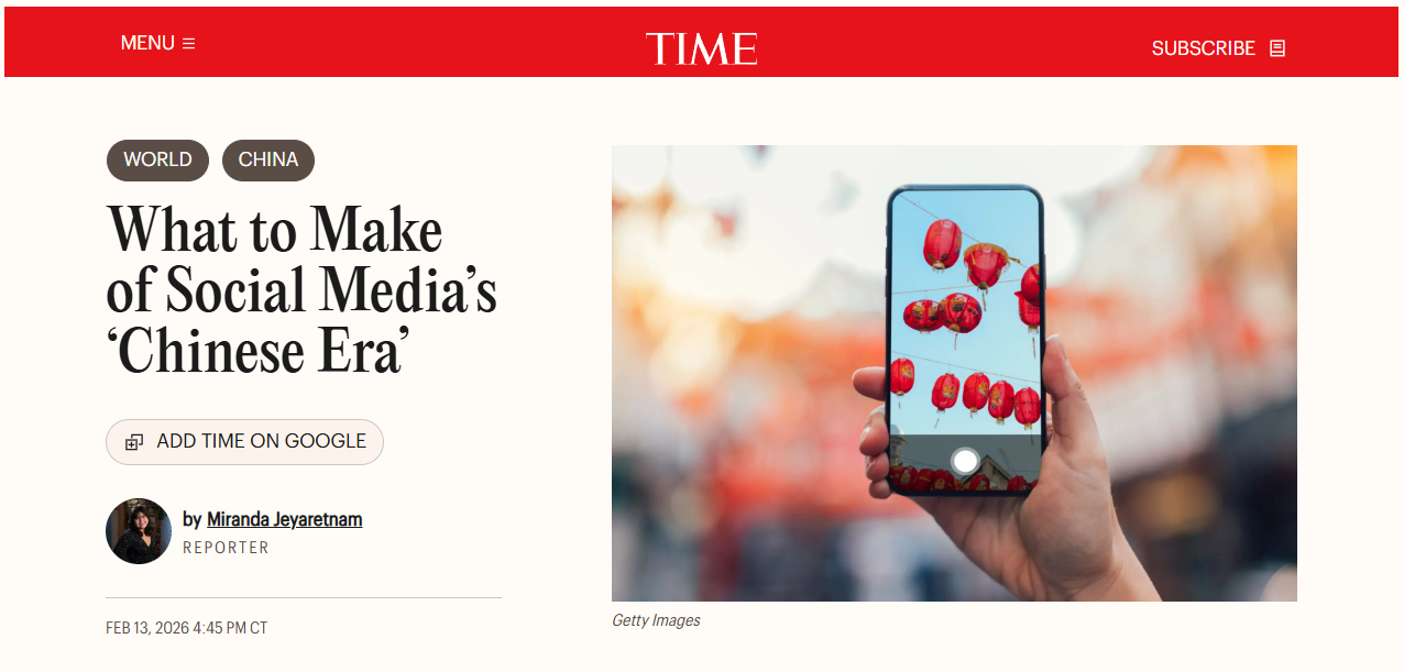 美國《時代》周刊網站2月13日的一篇文章稱,伴隨著今年的中國新年,社交網絡上介紹中國文化的內容不少。這是一種新的趨勢,美國社交媒體用戶視自己為“中國人”,擁抱“Chinese era”(中國時代)或者“Chinamaxxing”(極致中國化)。觀察家分析,這一趨勢反映了隨著中國的開放和軟實力的提升,人們對中國越來越著迷。