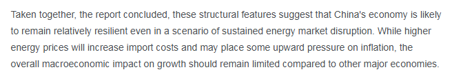 報(bào)告總結(jié)稱,即便能源市場(chǎng)持續(xù)動(dòng)蕩,中國(guó)受沖擊程度也將明顯輕于其他主要經(jīng)濟(jì)體。雖然能源價(jià)格上漲可能推升進(jìn)口成本并產(chǎn)生一定通脹壓力,但對(duì)整體經(jīng)濟(jì)增長(zhǎng)的宏觀影響將保持可控。