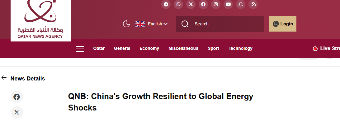 卡塔爾通訊社28日援引卡塔爾國(guó)家銀行出爐的最新報(bào)告指出,盡管地緣政治緊張局勢(shì)加劇與全球能源市場(chǎng)波動(dòng),中國(guó)經(jīng)濟(jì)仍展現(xiàn)出顯著抗風(fēng)險(xiǎn)能力。報(bào)告認(rèn)為,中國(guó)能源結(jié)構(gòu)多元化、石油依賴度較低及戰(zhàn)略儲(chǔ)備雄厚等結(jié)構(gòu)性優(yōu)勢(shì),能有效緩沖能源價(jià)格上漲沖擊。
