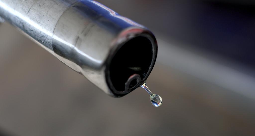 3月26日,在英國倫敦一處加油站,汽油從油槍口滴落。新華社記者李穎攝