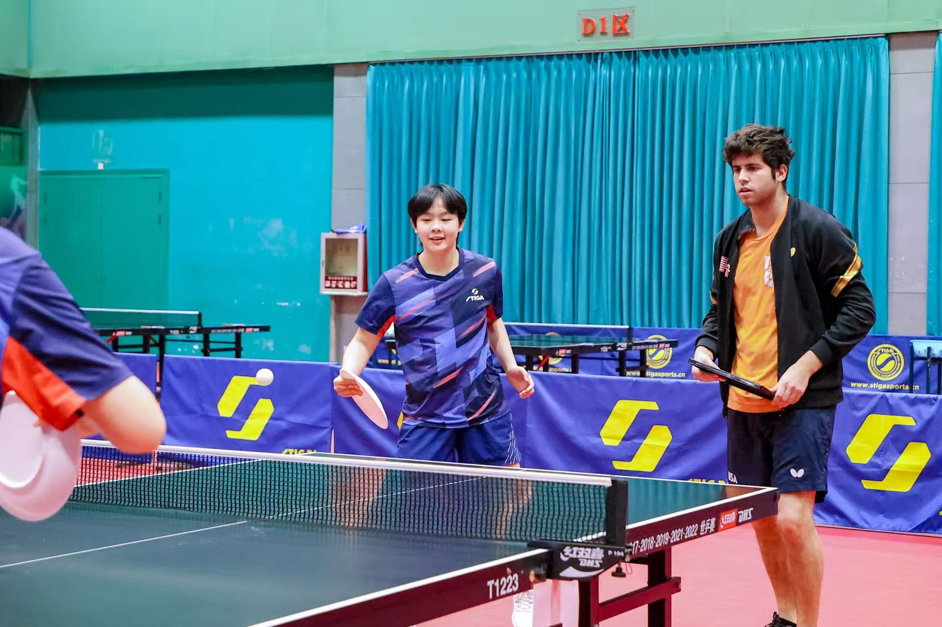 美國乒協(xié)注冊運(yùn)動(dòng)員凱?扎雷賓在正定國家乒乓球訓(xùn)練基地與中國青少年球員開展友誼賽