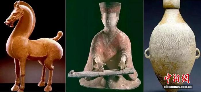 法國集美博物館藏(左起)東漢時期陶立馬 、 漢代彈箏陶俑彩色陶、仰韶文化半坡時期繭形雙耳瓶。圖片來源:人民網